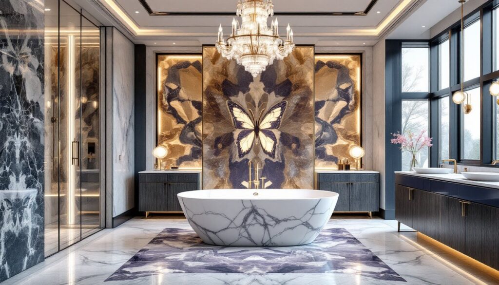 Book-matched marble creates mirror-image patterns across walls, requiring slabs cut from the same block and sequenced during installation. Calacatta Viola, Nero Marquina, and Arabescato Corchia appear frequently, with material costs alone reaching $30,000–$60,000 for a single bathroom.